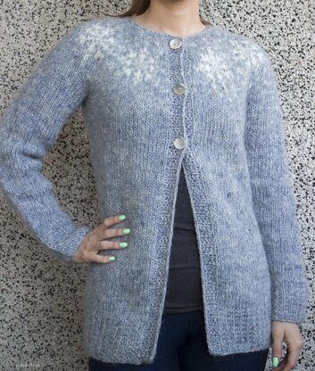 This is an adult cardigan inspired by the many, many Frozen sweaters for little girls. I wanted to make something more grown up but still kind of "frosted" or "Frozen" like. I also love snowflakes as a pattern and being from Iceland ... oh well it just all fits so well.