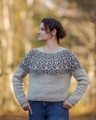 This pullover features a delicate colorwork yoke that has been inspired by frosty winter flowers. Short row shaping is used to shape the neck. There are no waist shaping in the pattern, however some waist shaping can be easily added. Sleeves are shaped with decreases. The length of the sweater can be modified since the pullover is worked from the top down.