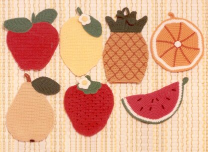 Fruit Potholder Mitts, #381. Crochet instructions to make 7 double-sided mitts so you can put your hand inside. Made in mainly sc so you won't burn your fingers. Uses worsted weight yarn, your choice of cotton or acrylic, but we recommend cotton for heat durability. Makes great bazaar items and gifts! Strawberry, apple, orange slice, pear, lemon, pineapple, watermelon slice. Complete your farmhouse kitchen with these 7 charming designs.