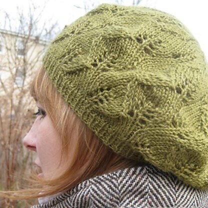 A classic 1 x 1 rib transforms into a beautiful leaf lace pattern for the body of this slightly slouchy tam. Decreases at the top form a seamless star motif.