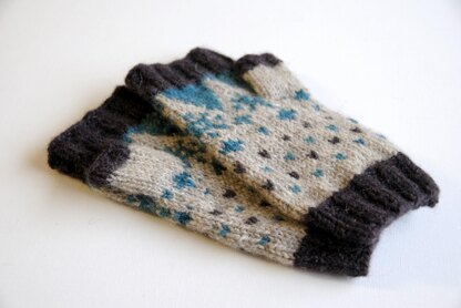 Frysa Mitts are a pair of fingerless mitts worked in stranded colorwork in three colors of DK-weight yarn. The mitts are worked from the cuff up in the round. Right and left mitts are worked as mirror images of each other.