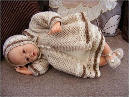 This lovely set comprises of Matinee Jacket, Dress, Hat and shoes.