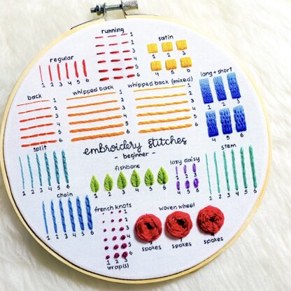 This is a digital PDF embroidery pattern that will teach you 14 beginner embroidery stitches that are very commonly used in the art of embroidery.\nOnce done, you can keep the piece as a reference guide for your future embroidery projects. :)\nPDF comes with photo guides and detailed steps to guide you in the right direction.\nProject teaches a variety of different beginner friendly embroidery stitches and their common uses. Perfect for those looking to learn embroidery!\n\n-- Follow me on Instagram @needlessdesigns or visit my shop on Etsy (needlessdesigns.etsy.com) for more embroidery patterns. --