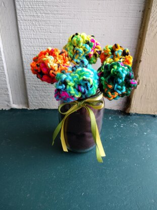 I used 2 strands of yarn held together to make these flowers. The multi (variegated) yarn combined with the solid color is what gives it a unique appearance! In the pattern photo Redheart Super Saver Blacklight was combined with solid colors. This is a great beginner pattern and also great for using up scraps of yarn!