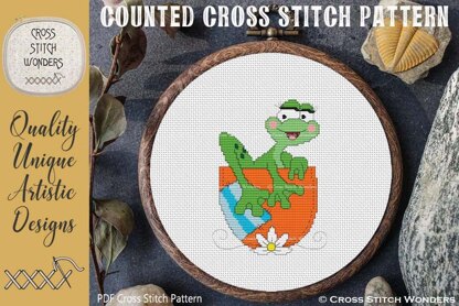 What a fun and cute FROG Design!\nOriginal licensed artwork by Embroidering Colors.\nCross Stitch Pattern designed by Marcia Manning.\n60 stitches wide by 81 stitches high.\nPDF is a COLOR counted cross stitch chart which lists suggested DMC floss colors, and includes a color picture.\nStitched design size is as follows: \nSize 14 count: 4.29 x 5.79 inches or 10.89 x 14.70 cm\nSize 16 count: 3.75 x 5.06 inches or 9.53 x 12.86 cm\nSize 18 count: 3.33 x 4.50 inches or 8.47 x 11.43 cm\nSize 22 count: 2.73 x 3.68 inches or 6.93 x 9.35 cm