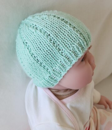 This 8ply baby Beanie is worked in a simple texture stitch and has a rib brim. Perfect for those new to knitting beanies, it is easy and quick to knit.