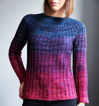 This is an intermediate pattern, and includes circular techniques and short row shaping for the back neck. The knitter must keep two sets of instructions going at the same time: the colour changes and the yoke shaping.