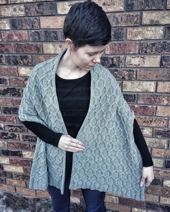 This densely cabled rectangular wrap features a cable motif reminiscent of a chain link fence. The edge-to-edge cables are achieved by using an i-cord edging that’s knit as you go. The wrap is offered in one size with notes on how to adjust to your preferences. All charts also have written instructions.
