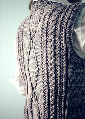 A beautiful cable and lace vest with a close shawl collar for keeping out the cold. A great layering piece for any wardrobe, Gamine does casual or dressy. An engaging knit, without too much fuss, this vest will be ready to wear in no time. This pattern is worked top down beginning with a provisional cast on. The back is worked first and then both front pieces, they are then joined and the body is worked in one piece. The buttonband/collar is worked in one piece. Short rows are used to shape the collar. Both written and charted instructions are included. Size 29.25 [32.75, 36.5, 40, 43.5, 47, 50.5] inch bust measurement, Modeled in size 32.75 with about an inch of negative ease. Materials Madelinetosh 80/10/10 Worsted MCN, 80% superwash merino wool, 10% cashmere, 10% nylon, 187 yards/171 meters, shown in Gossamer - approx. 4 [5, 5, 6, 6, 7, 7] skeins or 720 [800, 896, 976, 1064, 1152, 1232] yards worsted weight yarn. US 7/4.5mm (or size needed to obtain gauge) 24-32 inch circular needle and US 6/4mm 40 inch circular needle. 6 - 7/8