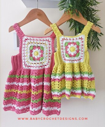 This dress is made starting with 2 granny squares, then adding some shaping and a skirt. It can be made in so many cute colours and is perfect for sunny days or over a sweater and tights for the cooler days.