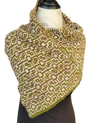 This cowl uses a mosaic pattern that gives the appearance of garden plots. Worked in one piece and then seamed, it is an easy project.