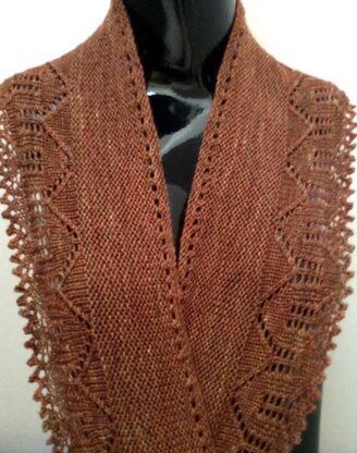 This unique 1-skein scarf is knit from the top down, rather than the traditional way of knitting from one end to the other. You'll see that the first half is knit in garter stitch and the final half is a lace pattern. The bind off is a simple picot stitch.