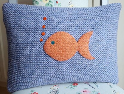 This Garter Stitch Cushion and the felted fish applique featured on the front were both knitted using Aran weight yarn. I used New Lanark Aran which is 100% wool and can be felted. The applique on front is a knitted square, which is felted in a washing machine. Once felted, the little fish shape is easily cut out with a pair of sharp scissors and sewn onto the front of the cushion.