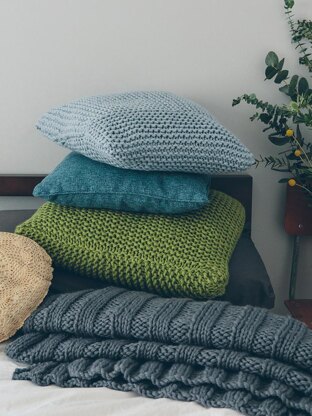 From the Knit Rowan website: Knit this homeware garter stitch cushion from 10 Simple Projects for Cosy Homes. A design by Sarah Hatton using our popular yarn Big Wool (merino wool), a perfect little addtion to your home.