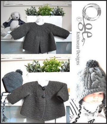This little garter stitch jacket with back pleat is knitted from the bottom to underarm, in one piece, sleeves knitted separately then joined to yoke. It is an easy knit, suitable for the experienced beginner knitter. The pattern also comes with a hat that has a simple cable pattern on front and back. The hat is one for the intermediate knitter, is knitted in one piece, then stitches are picked up around the hat to form the band. Schematic and chart for Cable is also included.