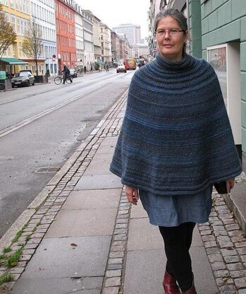 This poncho is an easy knit but not a quick knit as it is quite large. It is knit from the top down, on circular needles. The neck is a loose funnel neck with decorative purl stitch rings that also cover the shoulders. A couple of purl stitch rings at the bottom completes the poncho.