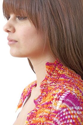 A combination of double and single yarn overs combine to create the striking, large scale lace pattern on this elegant stole. Using a larger sized needle adds to the openwork effect and it’s finished at each side with a ‘stepped’ edging which is knitted at the same time as the main pattern. The sample shown is knitted in a striking palette of hot colours but if strong colours aren’t for you, this design would also look great in a more subtle colourway or even a solid shade.