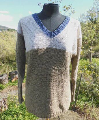 An attractive long sleeved jumper with V-neck in plain knitting in reverse in silk worked together with linen/cotton. The jumper is slightly fitted without being tight (optional). Welt, cuffs and neck band are in ribbing. The becoming V-neck is made in a tip-colour as a decoration. The jumper is worked in rounds until armholes - but if you prefer, it can be worked flat; instructions for that is included in the pattern as well as for short sleeves and a sleeveless version. Also beautiful in pure cotton or linen/cotton and/or plain coloured.