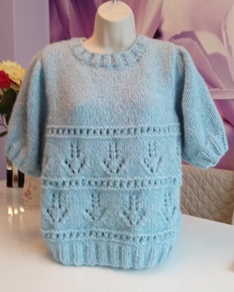 Straight needle size 6 mm:(US 10) Length 35 cm. Circular needle size 5 mm: (US 8) Length 40 cm cm. 250-250-300-300-350-400g light blue. 1 stitch holder.