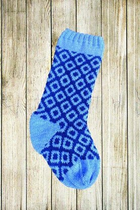 The Geometric Colorwork Christmas Stocking is worked in the round from the top down. The stocking features a geometric motif and can be personalized by adding an optional name band.