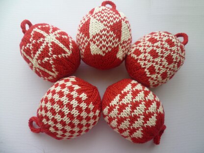 Festive Nordic baubles with geometric designs inspired by traditional Lithuanian mittens. The baubles are knit using the Fair Isle colourwork technique, with two strands of alternating colours on each row. Instructions are given for baubles knit in the round or knit flat. They work best knit in two strongly contrasting colours of 4-ply yarn - the baubles pictured are knit in Drops Baby Merino 4-ply in red and Knitcraft's 'It's only natural' organic cotton yarn in an off-white.