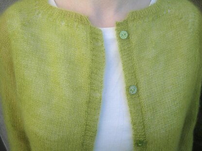 Yarn: 3 (4, 4, 4, 5, 5) skeins Plymouth Cape Town Collection “Kid Gloss” (229yds/25g; 72% super kid mohair, 28% mulberry silk) Shown in #0023 Lime