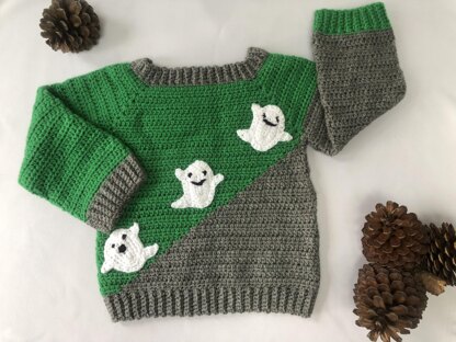 A fun halloween jumper for children aged 1 year to 7 years. The jumper has a diagonal colour change across the body and rib at the cuffs, collar and hem. Cute ghost appliques are worked separately and can be easily removed so that the jumper can be worn all year round. Fun to make and fun to wear, this jumper will become a favourite.