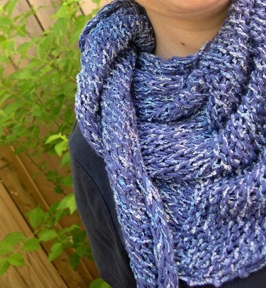Gigadistal is a reversible beauty, ideal for transitional weather or a cool morning. Wrap Gigadistal like a cowl by tucking its long ends around your neck or leave them hanging down for ornamentation instead. The use of a super-bulky or a doubled dk to bulky yarn can reduce stash, make great use of a hand-painted yarn and offer drape and lace when knitted on larger needles. Gigadistal is Distal’s cousin, using a similar concept to produce a smaller, kerchief size shawl. This asymmetrical shape is a quick knit, requiring only simple stockinette knitting, yarn overs, decreasing, and other basic skills. Use your crochet skills for an optional single crochet edging or add your own knit one as a finishing touch.