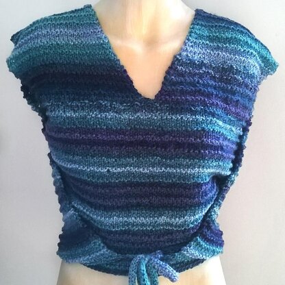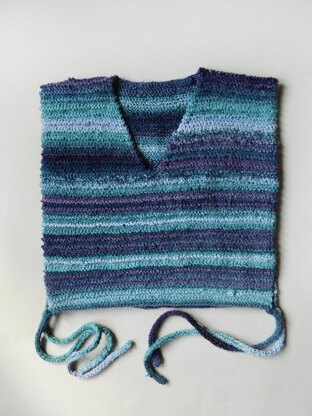 Il Gilet Oceano è realizzato in un unico pezzo a partire dalla base del davanti. Il modello risulta molto semplice di esecuzione. I lacci e la forma rettangolare permettono di adattare il capo al corpo.