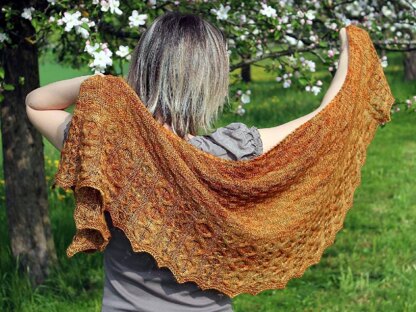 Gingerbread is a crescent-shaped shawl with a knit and purl body and a cabled border. 3 sizes, charted and written directions.