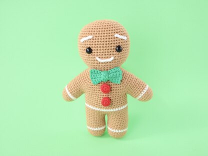 The Gingerbread Man is a no sew pattern, he is made as one piece from his feet to the top of his head. The only sewing you’ll have to do is to sew on his face, bowtie, and buttons. This pattern is written with US crochet notation and is an advanced beginner level pattern, some crochet knowledge of basic stitches is required. Step by step photographs are provided throughout the pattern. Using the materials suggested this doll measures 20cm (7¾in) tall. Any yarn can be used with this pattern with an appropriate size crochet hook to create a tight tension, although other yarns may affect the size of the finished doll. Suggested materials: DK (8ply) 100% cotton, 2.75mm crochet hook, toy stuffing, and 9mm safety eyes.