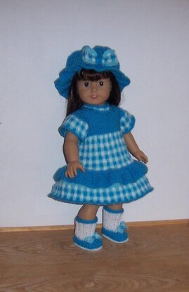 This listing is my own design for a knitting pattern, for an outfit comprising of a hat, dress, and matching shoes and socks, the outfit features a three color, gingham check pattern that runs as a theme throughout and fastens with 3 buttons at the back of the dress, The mob style hat has ribbon running around the brim. A pair of all in one shoes and socks complete the outfit