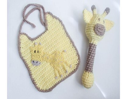 Adorably cute Giraffe Baby Bib and Baby Rattle Pattern with Giraffe Applique, very easy and quick to make with lots of pictures to help you along the way. Perfect gift for the perfect baby.
