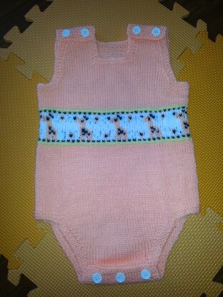 This onesie is knit in a round on a circular needle in one piece. It has a giraffe design on the chest.