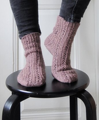 I wanted to knit woolen socks that could be described as girl's every day essentials. The kind of easy going, kind of minimalistic socks that fit in your winter boots but still look chic if you need to take your shoes off inside. A mixture of traditional ribbed socks with stripes of girly lace that is easy enough for the beginners. The lace pattern continues all the way down the heels and toes giving the socks a modern twist. These are the kind of socks that work for every occasion from snowy walks to sofa hangs at cozy coffee shops, from the first cold days of early fall all the way through to spring.