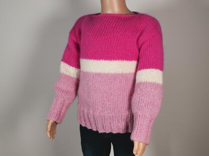 Sweater Pink is an easy knitting pattern for a girl's sweater in 5 sizes (4 till 12 years), which is knitted bottom up. The front piece and the identical back piece are knitted flat. The alternation of colors creates a beautiful stripe pattern. The used stitches are simple, namely knit and purl and knit 2 stitches together. You will need to sew the shoulder seams together, close the sleeves and sew them into the sweater and close the side seams.