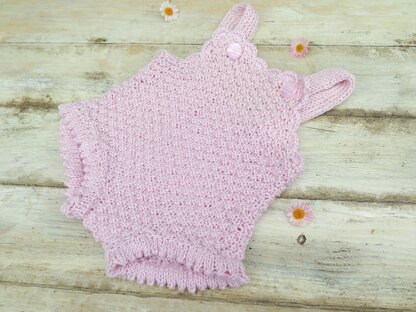 Here is my super cute, easy and fun to knit, baby girl romper pattern. Features double moss stitch pattern, picot edge leg bindings, soft shoulder straps and button front bib, as well as romantic crochet edging...perfect for babies summer wardrobe. Sizes included: 0-3 months - 3-6 months - 6-12 months - 12-24 months DK Wool or Cotton or blends 100 (150,150,200) g amounts may vary, depending on your choice of yarn, if in doubt get extra. Circular Knitting Needle (40 cm / 16'') SIZE 4 mm/US 6 stitch holders stitch markers crochet hook 4mm 2 buttons; 16 mm or 5/8" diameter