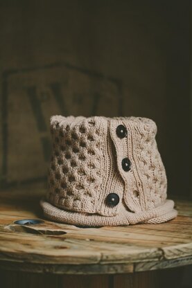 Cabled neck warmer with button placket.