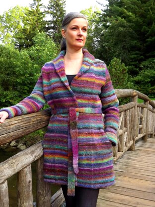 This is a standard fitting garment and has approx 2.5-10 cm / 1-4 ins positive ease. Gentle shaping throughout the body makes this a flattering fit for all sizes. Ease at bust can be modified by adjusting the overlap of the front panels. Construction consists of separate pieces worked flat, bottom up. The double faced shawl collar is worked as one piece along with the fronts, then folded and stitched in place.