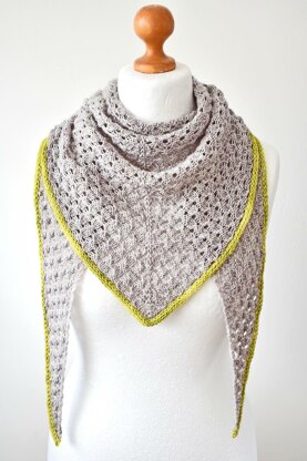 This triangular, arrow shaped shawl is knitted from the top down. The top edge is designed to curve gently upwards to produce a wide shawl that cradles around your neck and is easy to wear. The shawl is edged in a contrasting yarn to make a dramatic statement edge.
