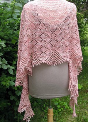 This crescent shawl is worked from the top down. Glinda begins with a garter-stitch tab and progresses through all stitch patterns with regular increases at both edges. The shawl is designed to be made with two 100-gram skeins of fingering-weight yarn in (choose semi-solid or tonal colorways for best results). Some clues have more texture; others have more lace. The overall pattern changes gradually from more solid sections to more lacy sections.