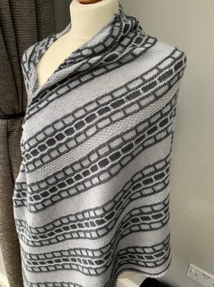 This crescent shawl is made up of two colours and a variety of slip stitches which create a striking pattern.