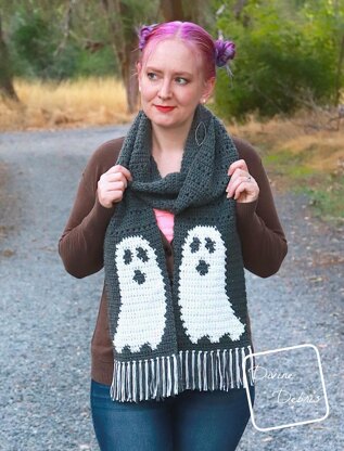 Put the “oo” in “spooky season“ with this eye-catching scarf, the Gloria Ghost Scarf. The combination of the cute ghost and the glow in the dark yarn helps to take the season from scary to fun with only some yarn and your crochet hook. This design is worked from the ends of the scarf toward the center in 2 separate pieces in back and forth rows. This pattern includes both the graph and written instructions for the ghosts and the scarf pieces, as well as some tips on how to keep your ghost tidy and readable. With a little fringe and some bright light, this scarf will be your favorite Halloween season accessory.