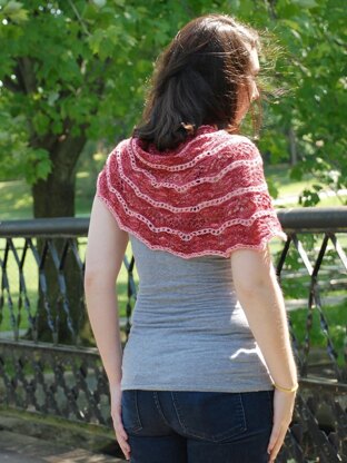 The half-circle shawlette features repeating bud and petal patterns with all of the increases worked in the contrast color yarnover rows. Specifically designed to use the contrasting heel-toe yarn from Paca Peds.
