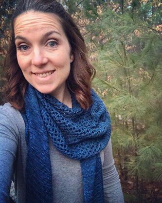 Go with the Flo is a sideways knit crescent formed with garter stitch, stockinette, ridged stockinette on the right and left side of a center lace panel and edged with a mock i-cord stitch that provides a neat, polished edge.