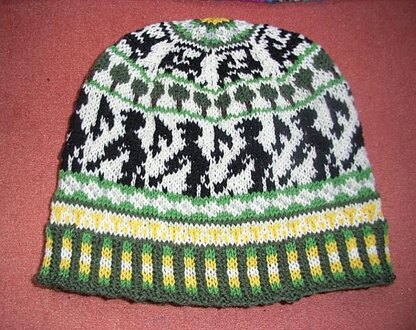 The beanie has a corrugated (= multicolor ribbing), followed by a Tee-boder and a golf ball border pattern (peerie). Then come the golfers in their typical position before hitting the ball... and you can see the hole with the flag in the back, too... Above is a band of trees. The top/crown includes 7 golf carts and repeats the golf ball peerie. It ends in yellow. And if you put on top of it a little golf ball pompon (you find the description in the pattern, I didn't add it) but you can see a similar pompon on the pictures of the [soccer beanie pattern][1] - it will look like the pompon is put
