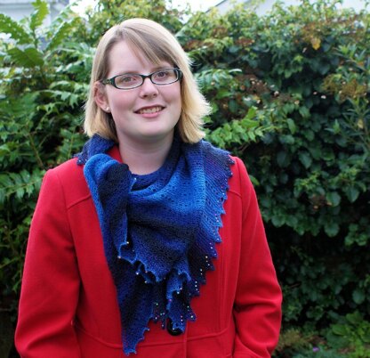 Colourful miracle/illusion beads are added to the lacy edging which is knitted alongside the shawl. The shawl is cast off using a beaded, picot cast off.