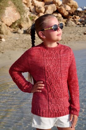 Sizes:  12 months = back width 25 cm (9.85”), total yarn needed 200 g (7 oz)  18–24 mos = 26 cm (10.25”), 230 g (8.11 oz)  3 years = 28 cm (11”), 250 g (8.82 oz)  4 yrs = 29 cm (11.42”), 275 g (9.7 oz)  5 yrs = 30.5 cm (12”), 300 g (10.58 oz)  6–7 yrs = 32 cm (12.6”), 320 g (11.3 oz)  8–9 yrs = 33 cm (13”), 350 g (12.35 oz)  10–12 yrs = 36 cm (14.2”), 375 g (13.23 oz)  12–14 yrs = 40 cm (15.75”), 450 g (15.9 oz)