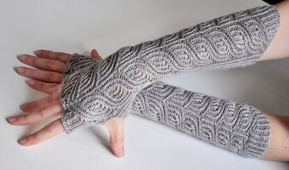 These are beautiful, elegant fingerless mitts knit in twisted ribbing. The lace pattern at the back of the gloves is easy to memorize. The fingers are created by sewing back and front of the gloves together. Length and width are adjustable.