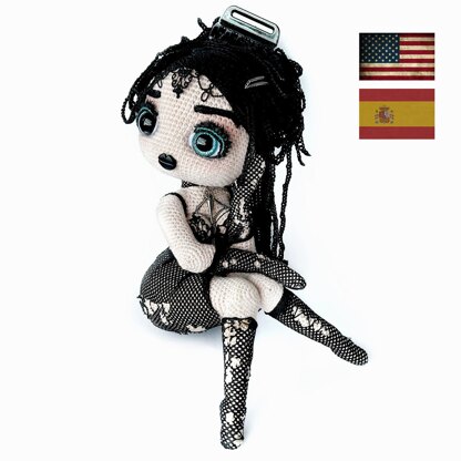 Crochet a darkly glamorous icon — an advanced MonoxaToys pattern with step-by-step illustrations and immersive videos. Vintage seduction meets gothic crochet art.